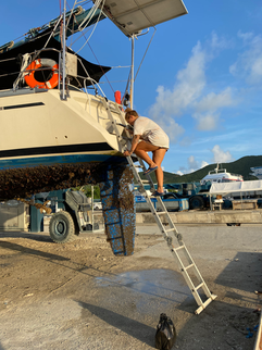 Holding Tank: Alright, get ready for a story, or feel free to skip ahead. Our boat was built in 1991, and was not manufactured with any type of holding tank. A holding tank is usually installed in a boat’s head (bathroom), and it does exactly what it says. If you are cruising or sailing in an area where it is illegal to dump blackwater waste into the water (such as the United States or Canada), a holding tank holds waste until it is able to be expelled into the water – either 5 nautical miles away from the borders of the US or Canada, for example, or at a marina where they can pump out one’s holding tank directly from the deck. Since we are planning to sail to the US Virgin Islands and Puerto Rico – both under the jurisdiction of the United States – we needed to install a holding tank for legality and environmental purposes. So, we purchased all the necessary materials (and there are A LOT of materials) and were ready to get started. Unfortunately, the seacock (a ball joint connected to a through hull, which sandwiches the inside and outside of the boat) connected to the toilet was seized in the ‘open’ position. Not a huge deal for our current situation, but if we needed to install a holding tank, that seacock MUST be able to close. This isn’t something to mess around with or change while the boat is in the water, in our opinion, so we needed to haul our big baby out of the water to deal with the repairs. We had our boat lifted in slings and were able to change out the faulty seacock, as well as drill a new hole in the boat to make the installation of the holding tank more simplified. It was nice to get all the barnacles off the hull in the meantime as well, even though seeing PR out of the water gave me a small heart attack! We also gave some love and attention to spots where the anti-fouling had worn through from rope chafe. We sanded, used an epoxy primer, and applied antifouling paint to those patchy areas to help the current antifouling paint last a bit longer. After all of this, we are now finally good to go and can legally take our boat into any US or Canadian territorial waters. It also increases the value of our boat to have a holding tank installed for future buyers, if it comes to that. Oof, what a job! Happy to have this one off the list!