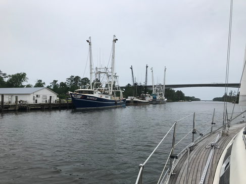 dinghy into town to explore. Oriental is known as the ‘sailing capital’ of North Carolina, where sailboats outnumber people 3:1! Lunch was had at M&M’s Café, where we enjoyed a crab corn chowder and buffalo shrimp, to die for! We hopped on the ‘Piglet’ free shuttle van to the Piggly Wiggly supermarket, and replenished our fresh provisions. Supper was king mackerel fish tacos on board, enjoying some of Paul’s catch from our Gulf Stream Passage. Tomorrow our next stop will be Belhaven, about 43nm further along the ICW.