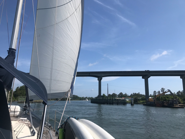 the river was quite wide, the channel we needed to stay between was pretty small, and it was a tight squeeze passing other sailing and motor vessels. About three quarters of the way up the river, we came upon our first swing bridge (with only a vertical clearance of 14’), the aptly named Alligator River Bridge. The bridgemaster was very friendly and helpful, and coordinated the bridge opening so that we could continue sailing on through. We found shelter from the moderate winds at Durant Island, an anchorage about